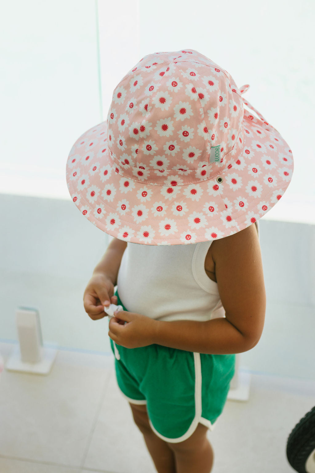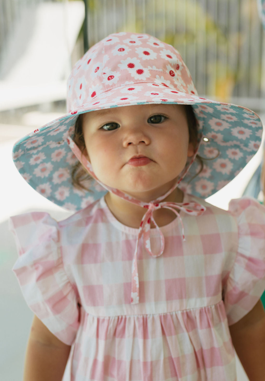 • Hat reverses to a blue and peach flower dot print on the other side