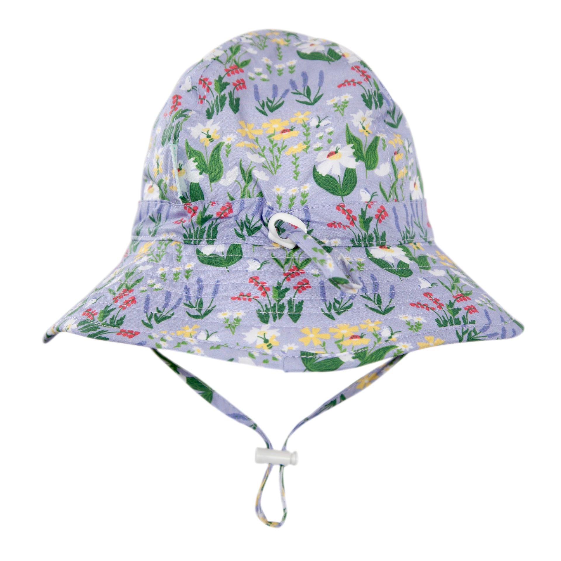Step into a summer of fun and sunshine with this wide-brim sunhat, featuring a sweet French garden-inspired print on a soft lavender base and a cream-and-black polka dot print on the inner brim, designed by Jacinta Weir from Two Little Ducklings. A perfect hat to brighten every sunny outfit!
