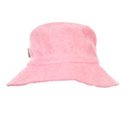 A fun terry towelling bucket hat in a light pink colour with a white contrast pocket on the side, giving all the cool retro vibes this summer.