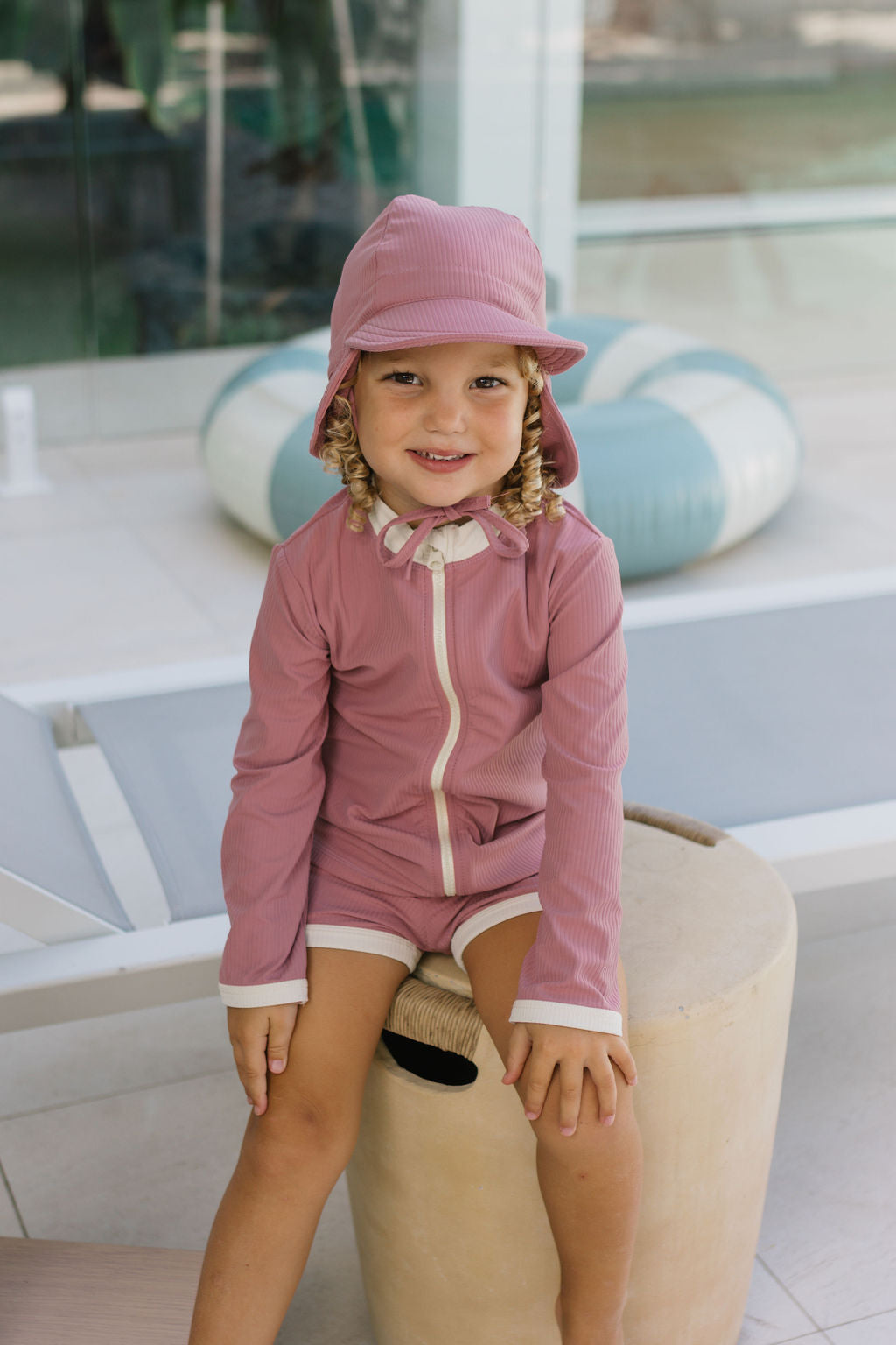 Made from a soft, textured fabric in a dusty pink blush with contrast cream details, this swimsuit is both comfortable and stylish.