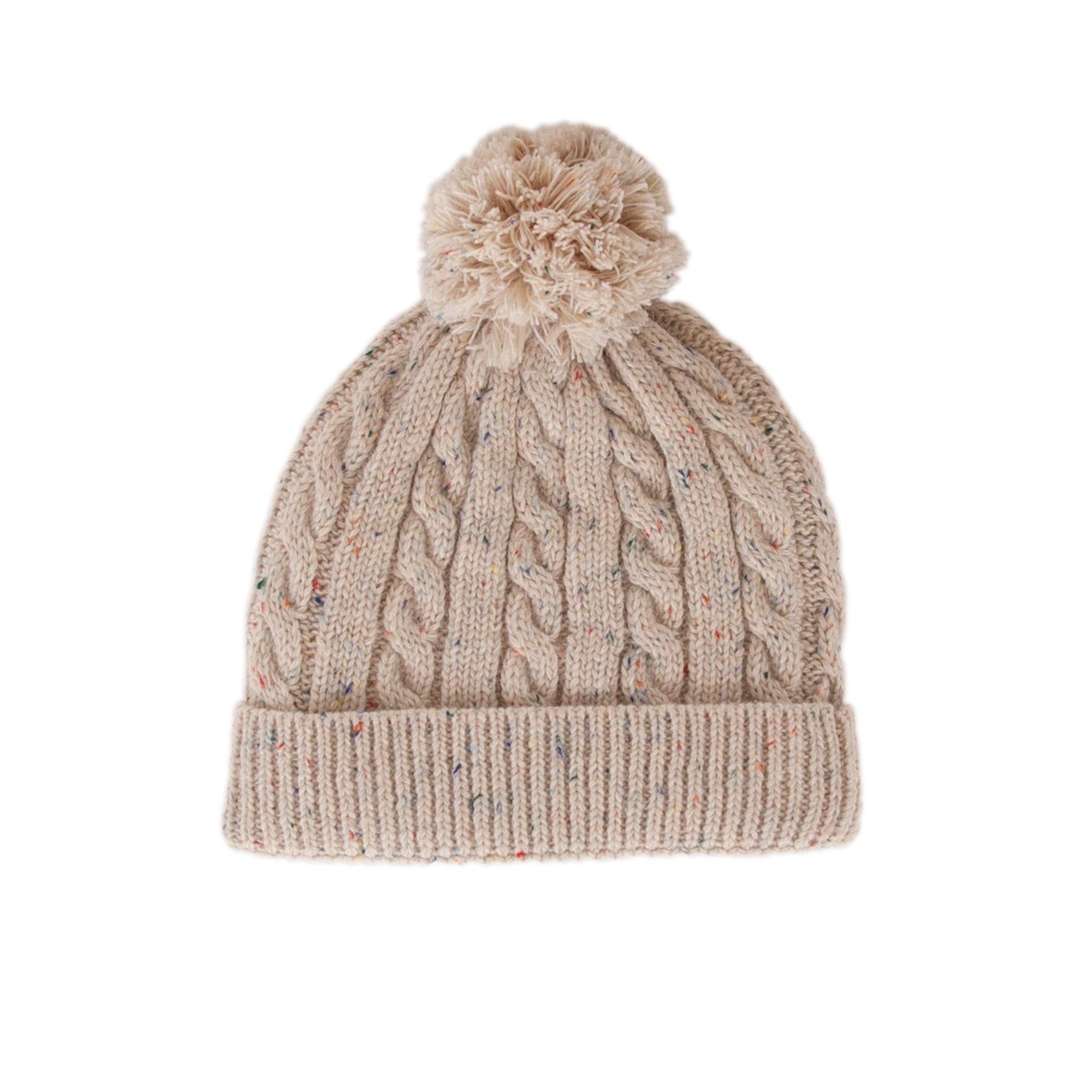 This sweet beanie is made with a lovely oatmeal yarn with a fun speckled pop of colour throughout. A classic cable knit pattern with a very stretchy and comfortable rolled ribbing at the face and a fun pom pom on top.