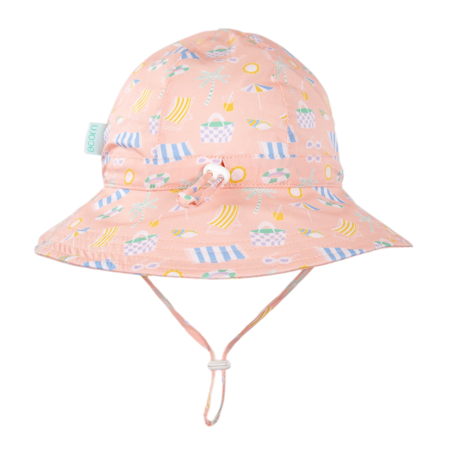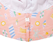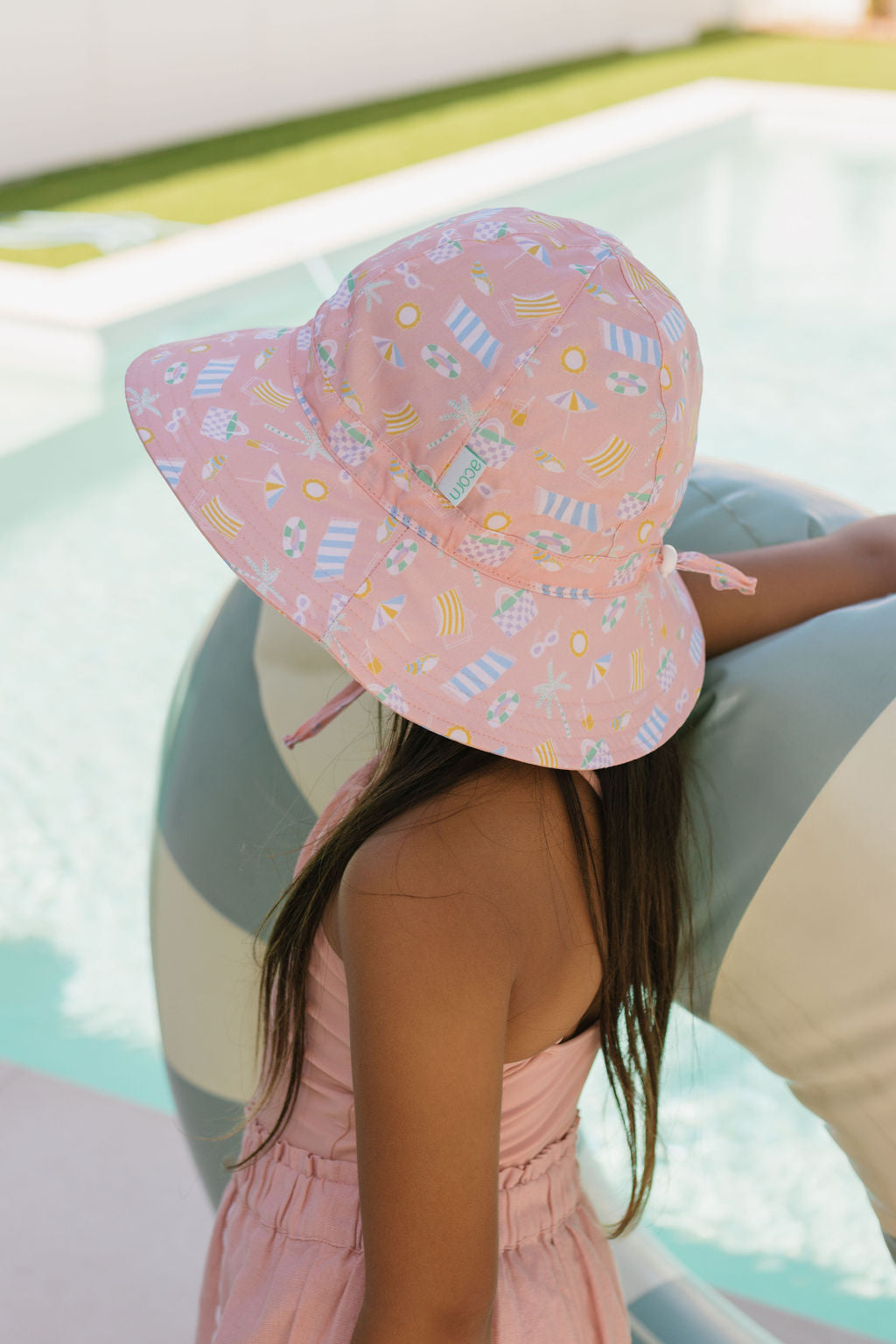 Perfect for sunny days at the beach or by the pool, this wide brim sunhat features a super cute print with deck chairs, pool rings, umbrellas, and more, designed by Jacinta Weir from Two Little Ducklings.