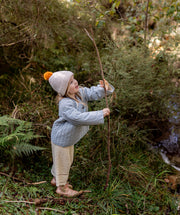 This adorable beanie is made from a merino wool blend with cute speckled yarn in a fishermans' rib stitch. It's super stretchy and comfy, and has a cosy rolled ribbing at the face and a fun contrast pom pom on top.
