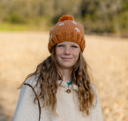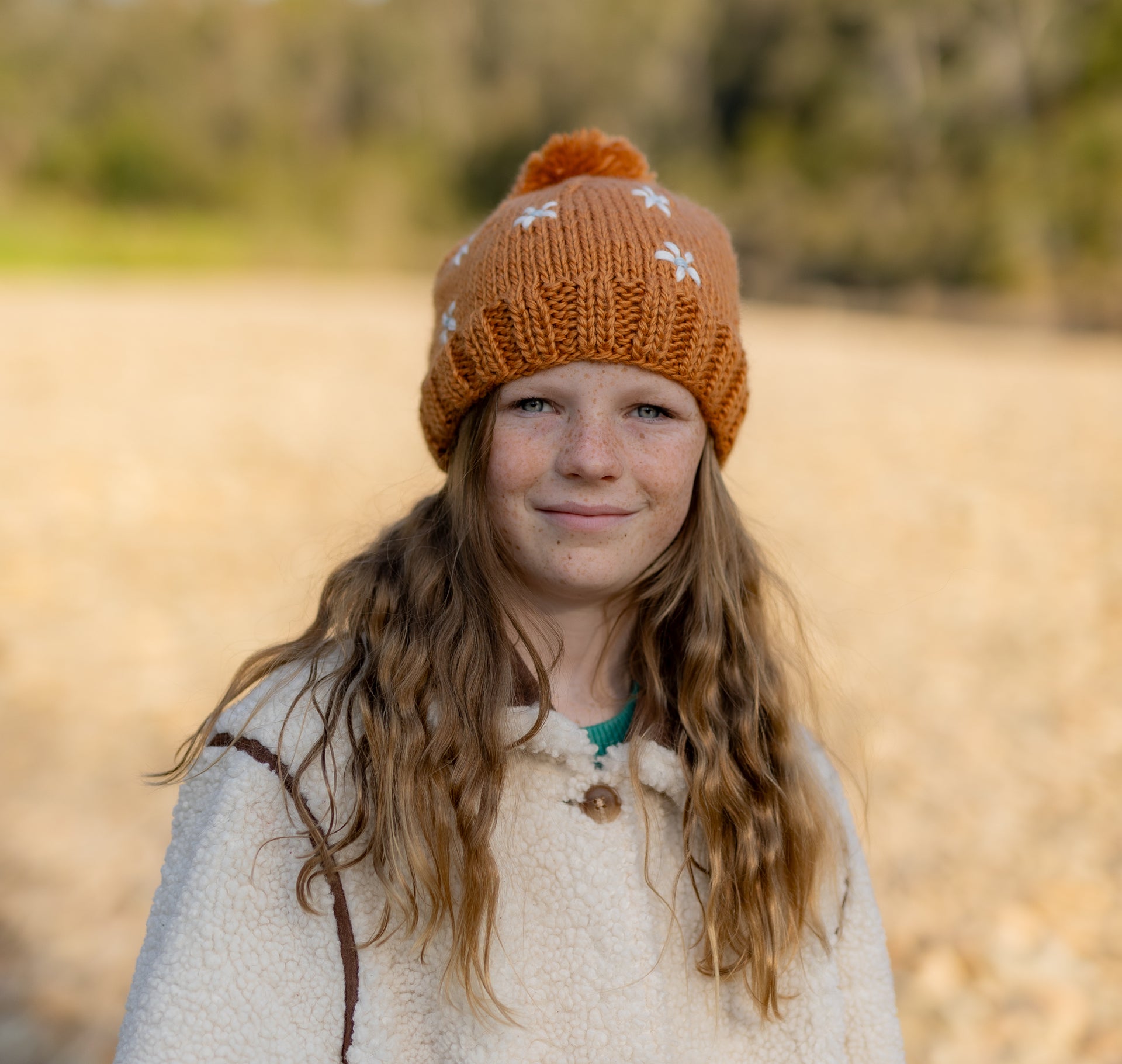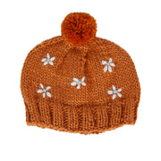 This gorgeous hand-knitted beanie features an adorable daisy embroidered pattern on the front. Its soft and stretchy ribbing around the face ensures a gentle and snug fit. Plus, a cute pom pom on top adds the finishing touch.