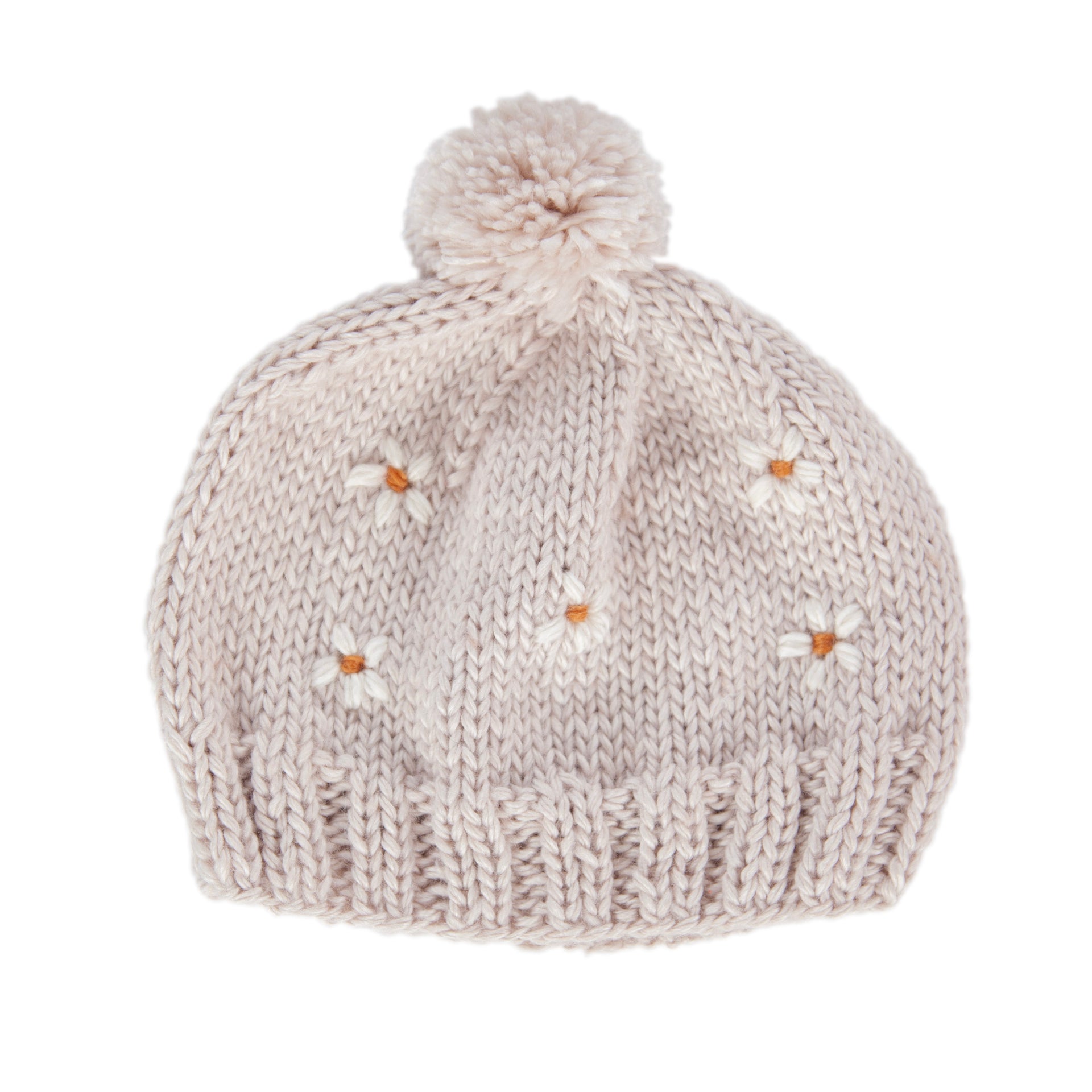 This gorgeous hand-knitted beanie features an adorable daisy embroidered pattern on the front. Its soft and stretchy ribbing around the face ensures a gentle and snug fit. Plus, a cute pom pom on top adds the finishing touch.