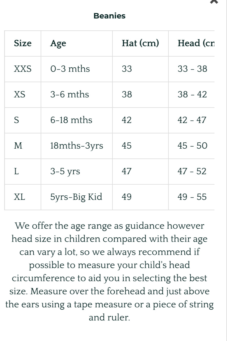 We offer the age range as guidance however head size in children compared with their age can vary a lot, so we always recommend if possible to measure your child's head circumference to aid you in selecting the best size. Measure over the forehead and just above the ears using a tape measure or a piece of string and ruler.
