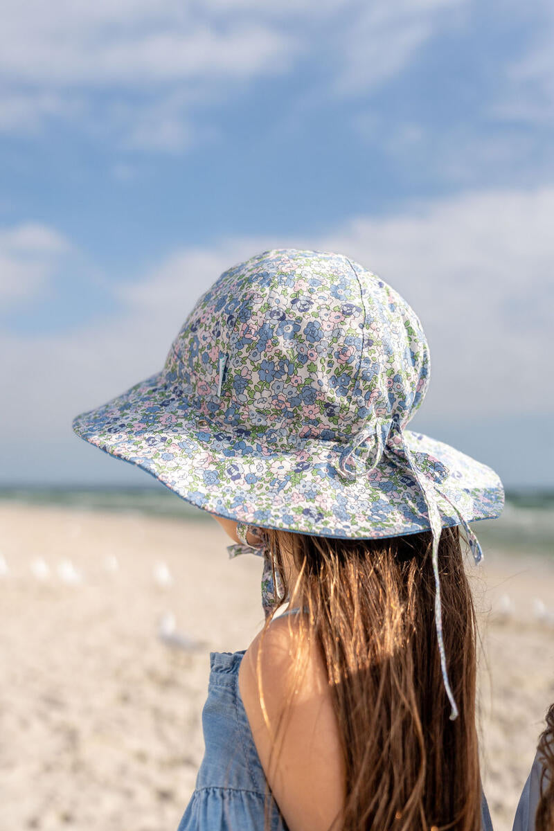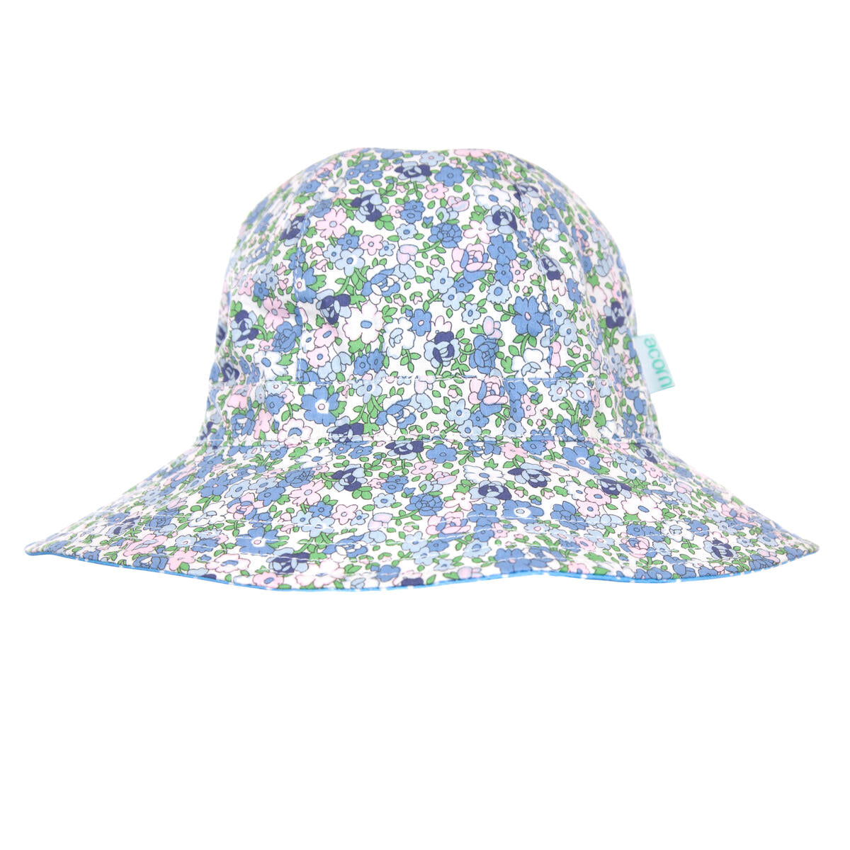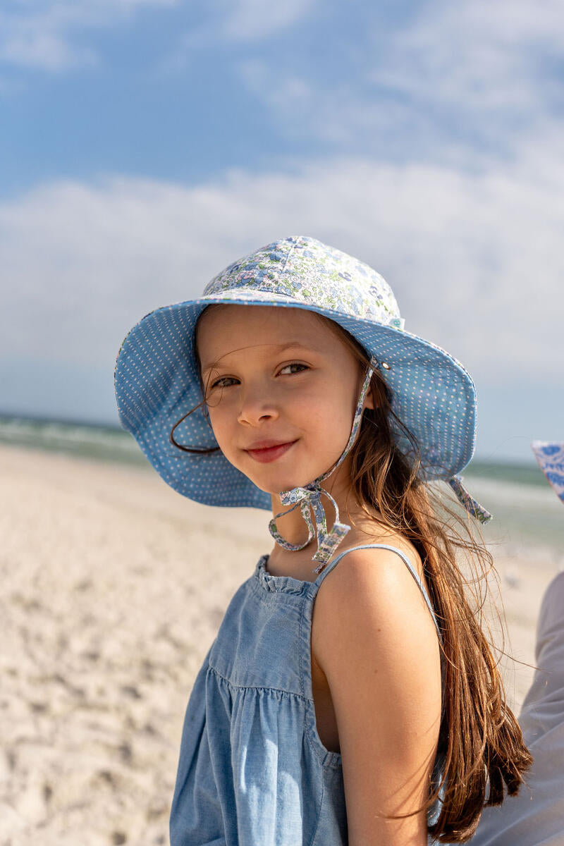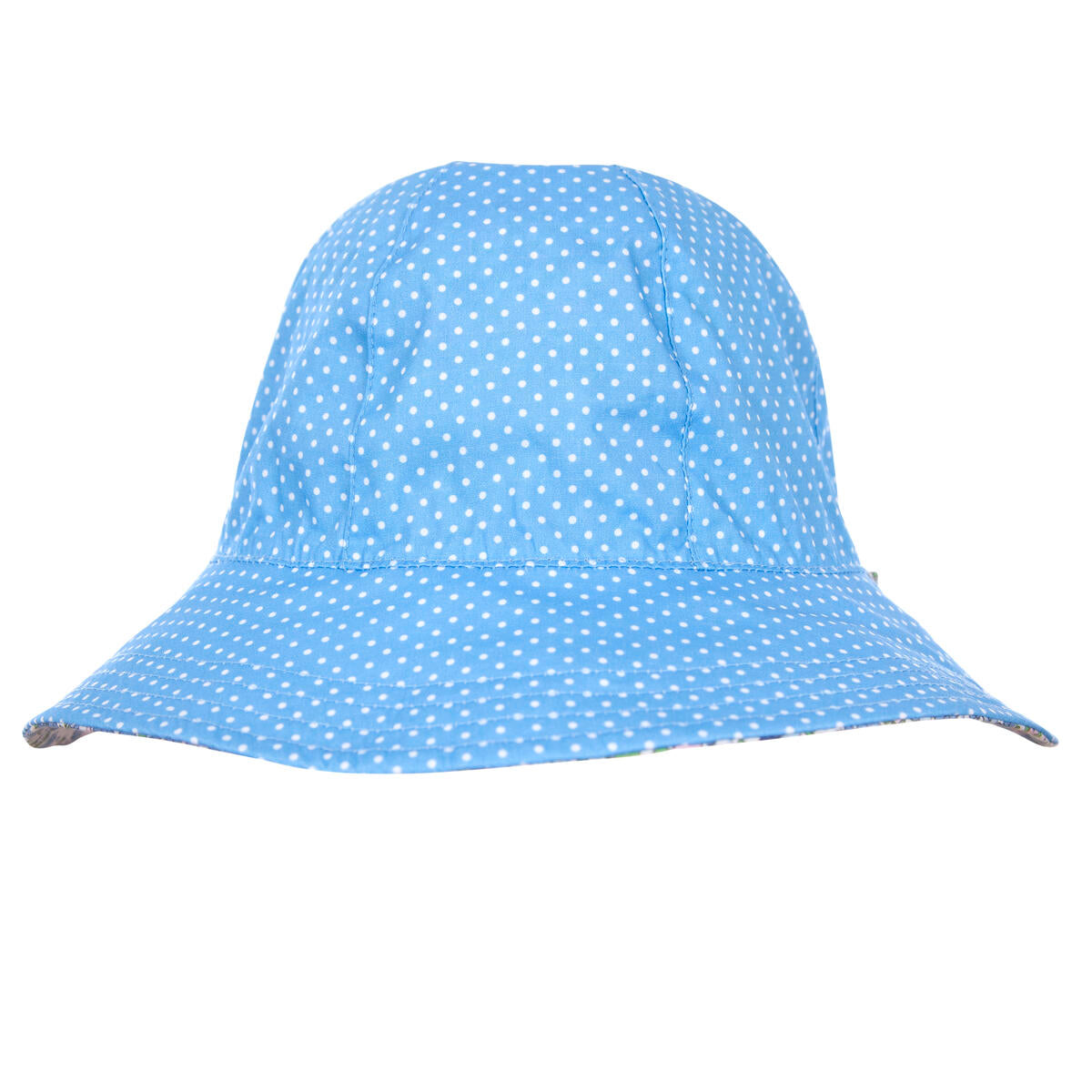 A lovely reversible wide brimmed sunhat with a blue and pink floral print on the outside and a a blue and white polka dot print on the reverse.