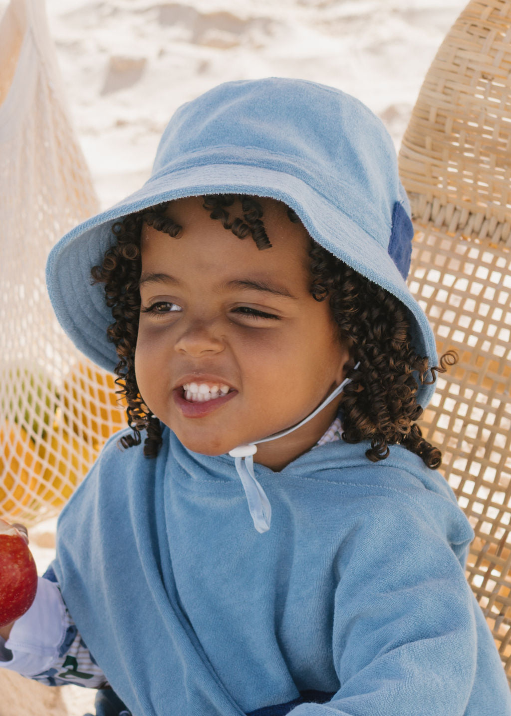 This super soft terry towelling bucket hat in mid blue, complete with a dark blue contrast pocket on the side, is serving up classic retro-cool. Perfect for sun-drenched days, salty hair, and carefree adventures, it’s the hat they’ll want to wear on repeat.