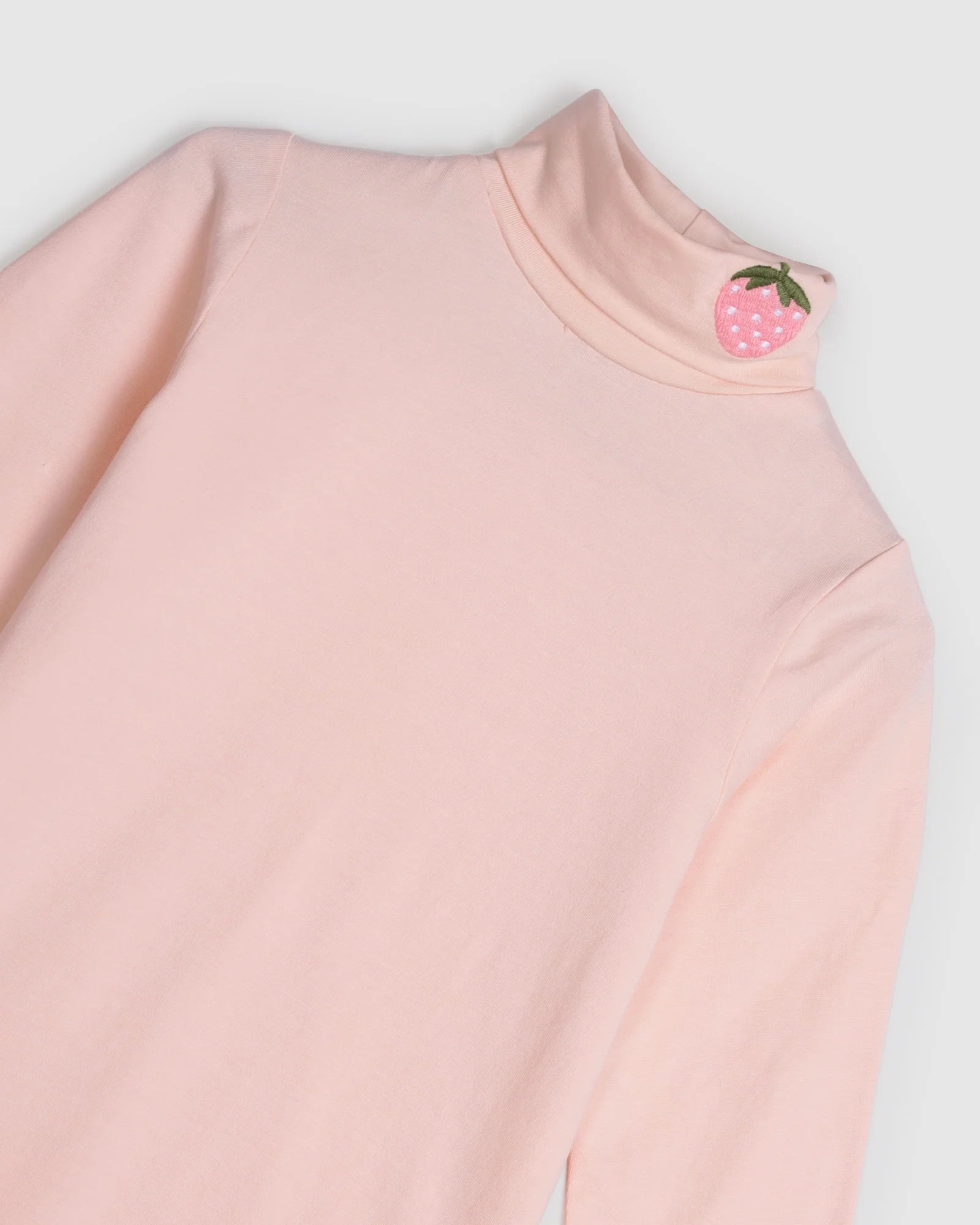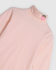 Introducing the Olive Skivvy in Baby Pink ... The perfect turtleneck top for winter. When rolled, we feature an embroidered strawberry for extra cuteness and style. Made from the softest cotton jersey.