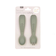 Each set includes one spoon and one fork, both featuring a soft, curved handle with raised sensory bumps for a comfortable, easy-to-hold grip, perfect for tiny hands still learning coordination.