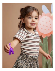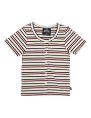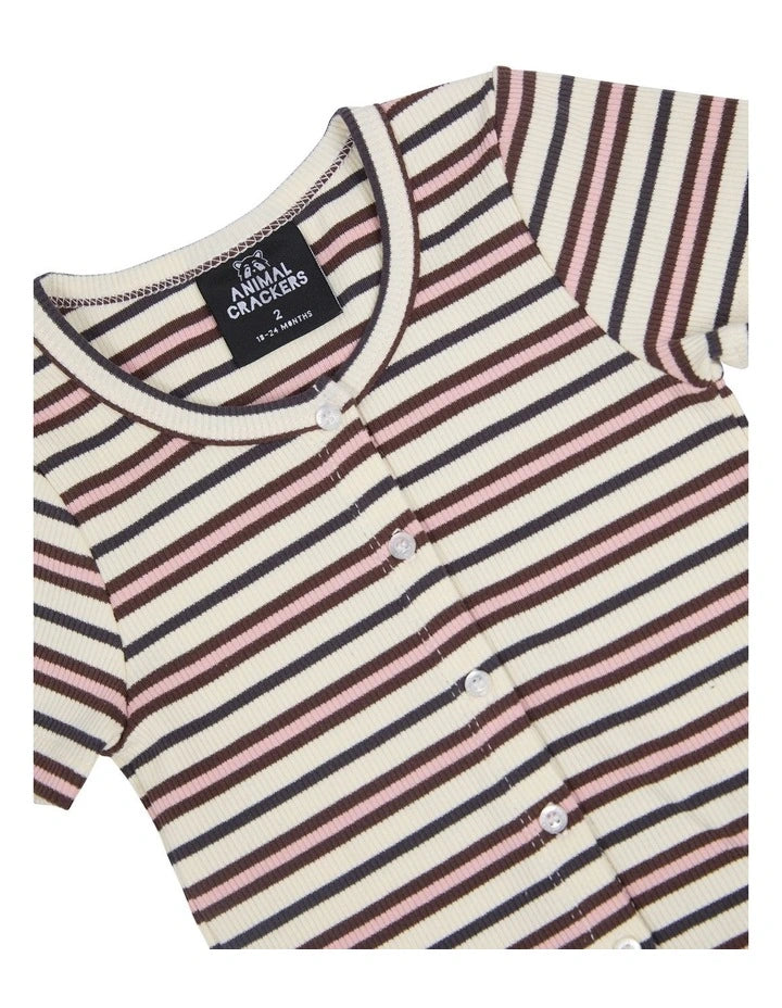 The Stripe Button Up Rib by Animal Crackers is made from a super comfortable cotton elastane rib. Featuring a stripe design, CF button-up closure, round neck and branded flag label. Team back with the Animal Shorts for the perfect summer outfit.