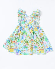 Bring on the holiday vibes! The Eden Dress in Vacay Yay is a tropical daydream, bursting with colourful illustrations of palm trees, rainbows, fruit and sunshine. Crafted from soft cotton with fluttery ruffle sleeves and a full gathered skirt, this easy-fit dress is ready for sunny adventures, beachside strolls, or dancing barefoot in the backyard.