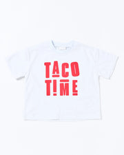 It’s always taco time in this fun and bold tee! Made from super soft, breathable cotton. this white t-shirt features a playful red “TACO TIME” graphic in chunky block lettering that’s full of personality—just like your little one.