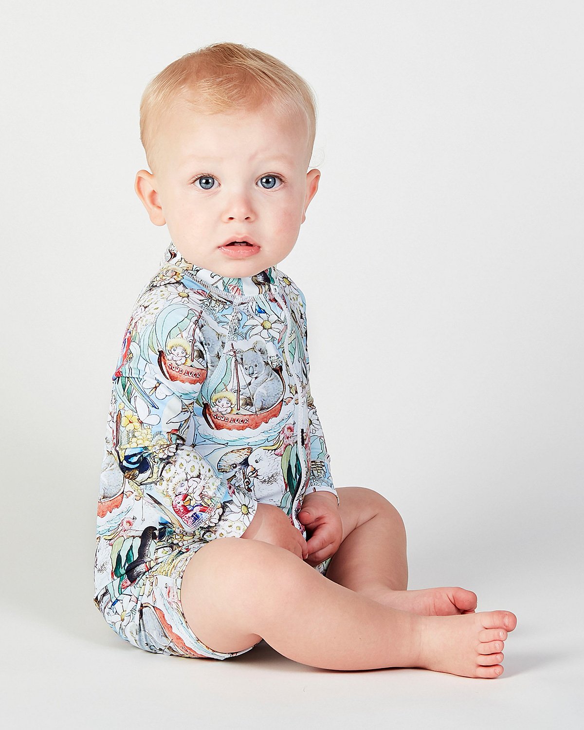 The Pippie Body Swimsuit is a perfect piece for long sunny days at the beach or pool, featuring a zipper front for the easiest of dressing, long sleeves and a short leg. With a UPF 50 Rating, these bathers shield the skin from UV rays all day long. Finished with the classic May Gibbs Storytime print.