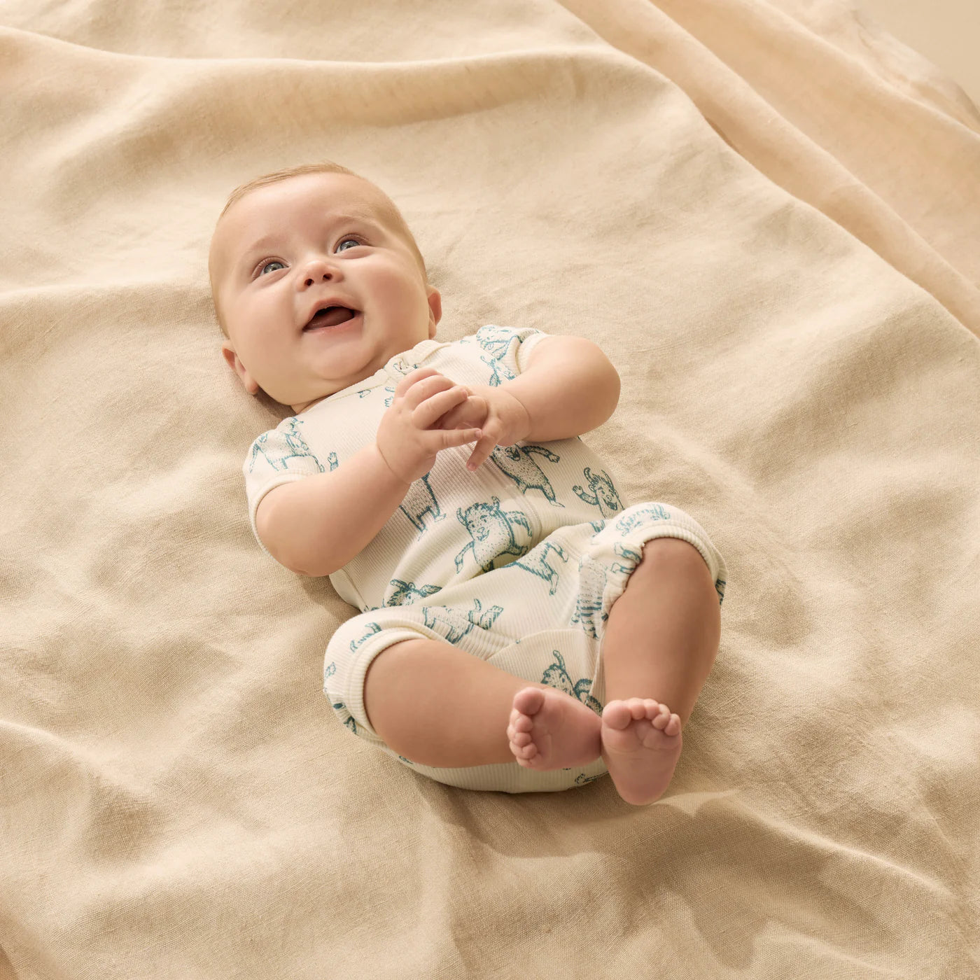 This short-sleeved, short-leg zipsuit is a must-have for warmer days. Made from GOTS-certified organic cotton rib, it offers added stretch, breathability, and all-day comfort — perfect for active little ones. Featuring our fun all-over Yeti print, this zipsuit is gentle on delicate skin and free from harmful chemicals. A full-length front zip makes changes quick and easy, while a protective zip cover at the neckline keeps baby comfortable. A practical and playful summer essential.