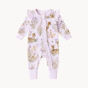 Enchanted Gardens features dreamy blooms and a sweet baby deer, brought to life on our signature bamboo and organic cotton blend. These buttery-soft zippies include a zip front and delicate shoulder frills—perfect for all-day comfort and effortless style.
