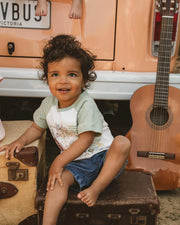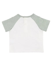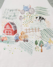 This sweet little tee brings to life a day on the farm, complete with rolling fields, barnyard animals and vintage tractors. Made from soft, breathable 100% cotton, it features sage green raglan sleeves and a hand-drawn style print that captures the magic of rural play. A back neck button makes for fuss-free dressing, while the comfy fit is perfect for everyday adventures.