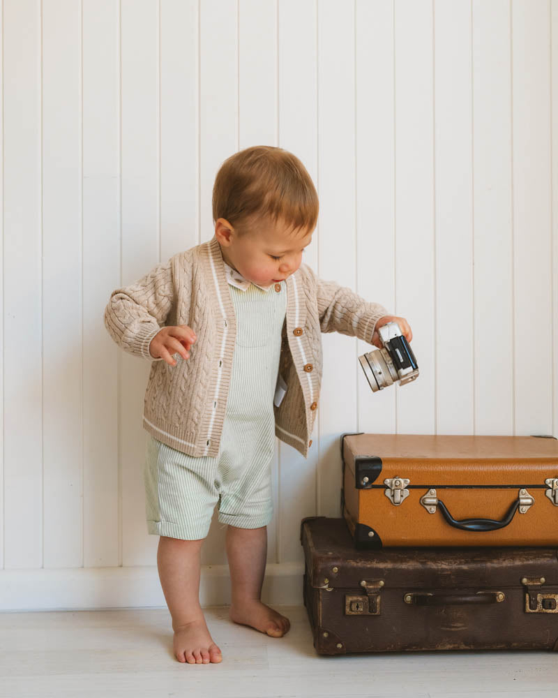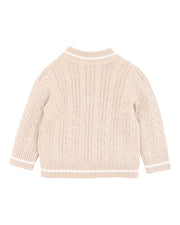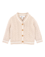 A timeless wardrobe staple for cooler days, this soft 100% cotton knit cardigan brings classic charm to little outfits. Featuring a traditional cable knit design with contrast stripe details at the cuffs and hem, it’s finished with a shawl collar and button-down front for easy layering.