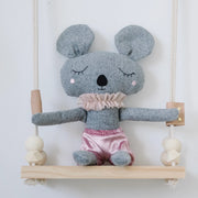 Mabel Mouse, the softest and most nostalgic friend you'll ever have. Made with a wool blend fabric and complete with blush velvet bloomers, she'll bring a touch of whimsy to your life. Enjoy watermelon on hot days, find fairies in your garden, and put on puppet shows with Mabel by your side.