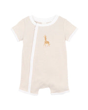 Keep your little one cool and comfy in our soft and breathable Organic Cotton Short Sleeve Zipsuit. Featuring an all-over natural stripe and a sweet little giraffe friend at the chest, this easy one-piece is made for sunny day adventures and cozy cuddles. The short sleeves and short legs keep things breezy, while the front zip opening makes for quick changes on the go. A soft, stretchy rib finish ensures all-day comfort.