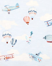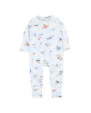 Made for little dreamers with their heads in the clouds, this sky-blue zip romper is perfect for everyday play or drifting off to sleep. Featuring an all-over print of vintage planes, hot air balloons, and whimsical aircraft, it brings a sense of adventure to your baby's wardrobe. The soft cotton elastane fabric ensures comfort and stretch, while the full-length zip makes for quick and easy changes-with a safety fold at the top to protect delicate skin. Fold-over mitten and foot cuffs offer added warmth and versatility as baby grows.