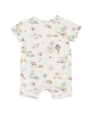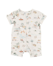 Pack the adventure into every day with our Australian-themed romper, scattered with adorable native animals and camping moments. Crafted in a soft cotton elastane blend for comfort and stretch, this short sleeve style is perfect for warm weather exploring. The easy front zip opening with safety fold at the neckline ensures quick changes, while the all-over print adds a playful Aussie spirit to your little one's wardrobe.