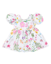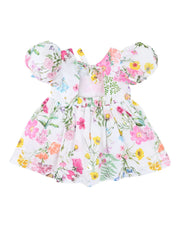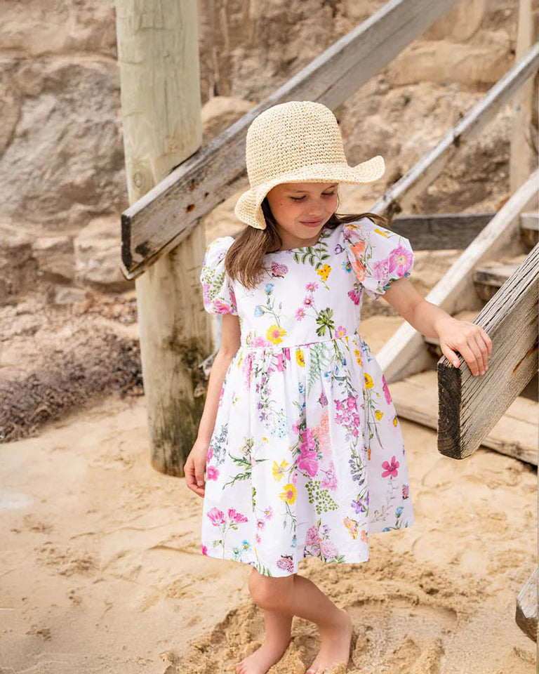 A bloom of colour and charm, this sweet dress is ready for sunny days and garden adventures. Featuring a vibrant all-over floral print, playful puff sleeves and a softly gathered skirt, it's a standout style for any little one's summer wardrobe. Fully lined for comfort, with a tie back detail for a pretty finish.