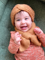 Keep little ears warm and toasty this winter with this hand-knitted head wrap. Made with a ribbed stitch and cross over feature at the top of the head