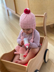 Features a fun pom pom on top and a comfortable and stretchy 2x2 ribbing at the face.