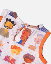 The orange trim at the neckline and armholes adds a pop of color, making this sleeveless dress both stylish and comfortable for warm weather. Made from soft, breathable fabric, it’s perfect for sunny days, playdates, or casual outings.