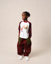 Constructed in a lush 97% Cotton, these elasticated barrel pants with their functional drawstring are sure to last them quite a few seasons of wear. A patchwork pocket detail adds a fun twist to the usual winter -gloom.