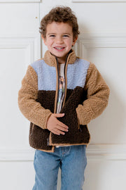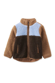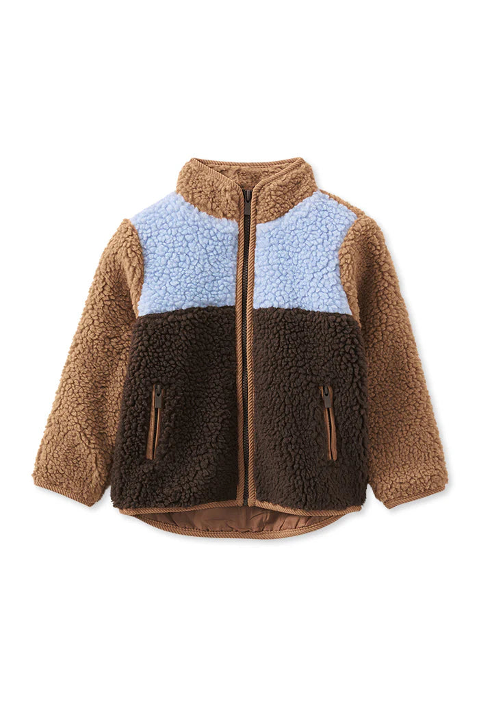 Designed with a stylish panelled look, it features brown sleeves and a collar stand, complemented by a light blue upper chest and a chocolate brown lower body. The soft fabric is enhanced by cord trimming and functional front zip pockets, perfect for storing all those little treasures.