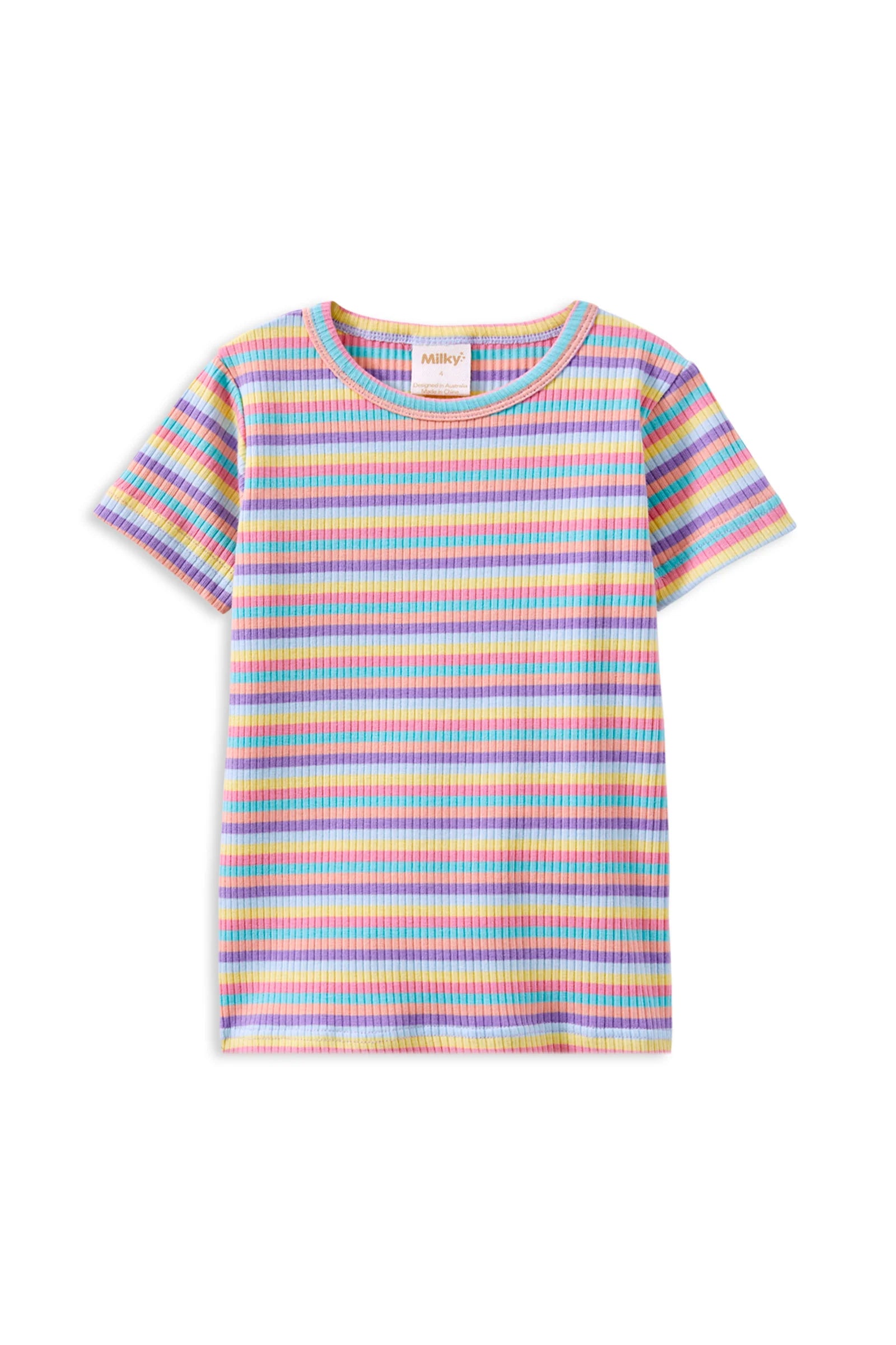 Milky Clothing Multi Stripe Rib Tee is a versatile essential for your summer wardrobe. Crafted from a stripe rib, this timeless piece offers effortless style for any occasion. Featuring a classic round neckline and short sleeves. Pair it with your favorite Milky shorts or skirt for a casual look, or layer with pants and a cardigan when the weather cools down. Available in many charming colors, this tee is designed to withstand wash after wash, promising lasting comfort and style.