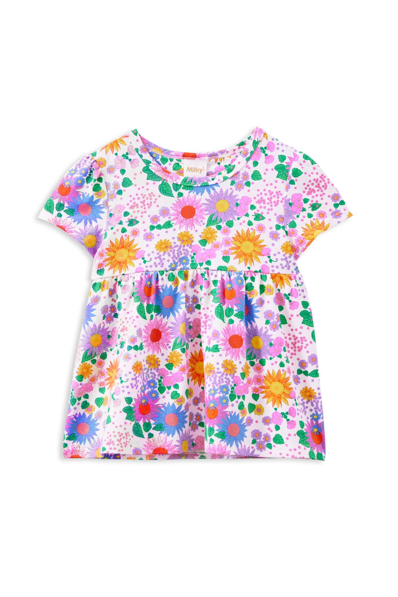 Milky Clothing Sunshine Floral Swing Tee is the perfect fun and flowing addition to your little one's wardrobe. Crafted from a soft cotton-rich blend, this sweet tee features a bright floral print on a white base. With short sleeves and a gathered waistline, it offers a flattering, airy fit that's perfect for twirling. Pair it with the matching Sunshine Floral Bike Shorts for a coordinated, trendy look, or team it with your favorite Milky shorts or leggings for a breezy, effortless style. This versatile tee is sure to keep your little one both stylish and comfortable all day long.