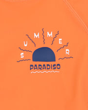 Ready for all-day adventures under the sun, this bold orange rashie is a standout addition to your young one’s swim wardrobe. With its vibrant colour and playful “Summer Paradiso” chest print, it brings fun and energy to every splash, dive, and sandy run. Pair it back with the matching Conway boardshorts for a beach-ready combo that’s as stylish as it is sun-safe.