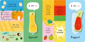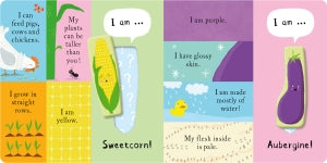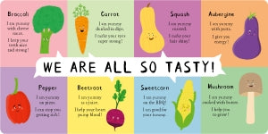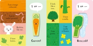 Pull out the sliding tray in the cover to reveal removable, double-sided veggie characters. Little ones will love following the clues to match the correct board piece to each page! Do you know which veggie doesn't need light to grow? And which veggie is really a flower? With simple facts to share along the way, this is the perfect book to encourage balanced, healthy eating habits through play. An interactive guessing game and early learning board book in one!