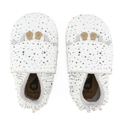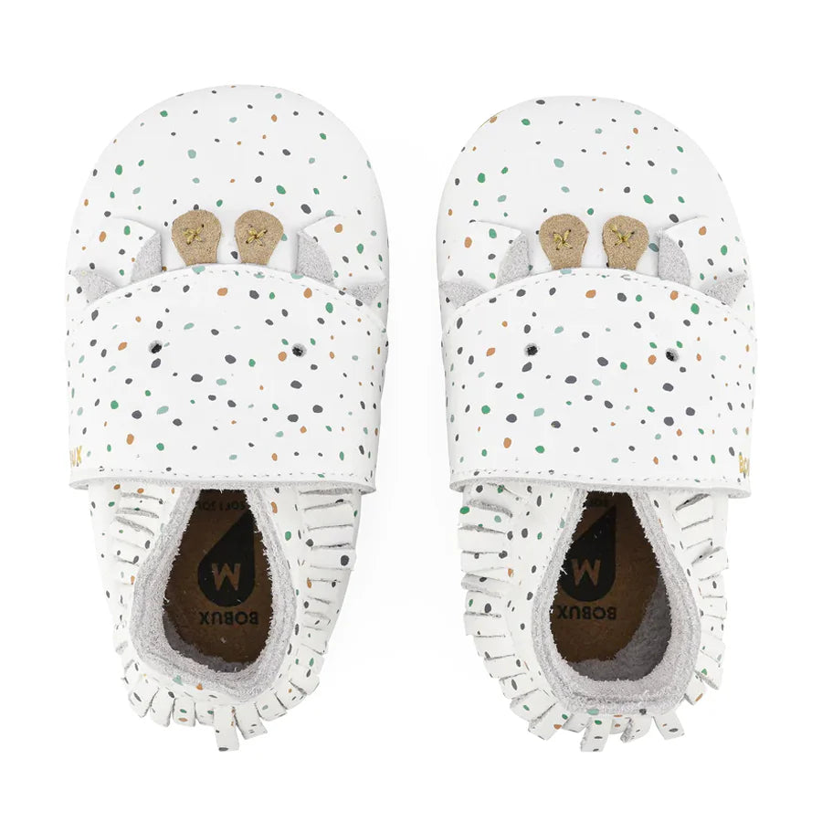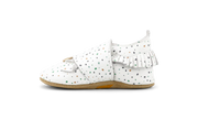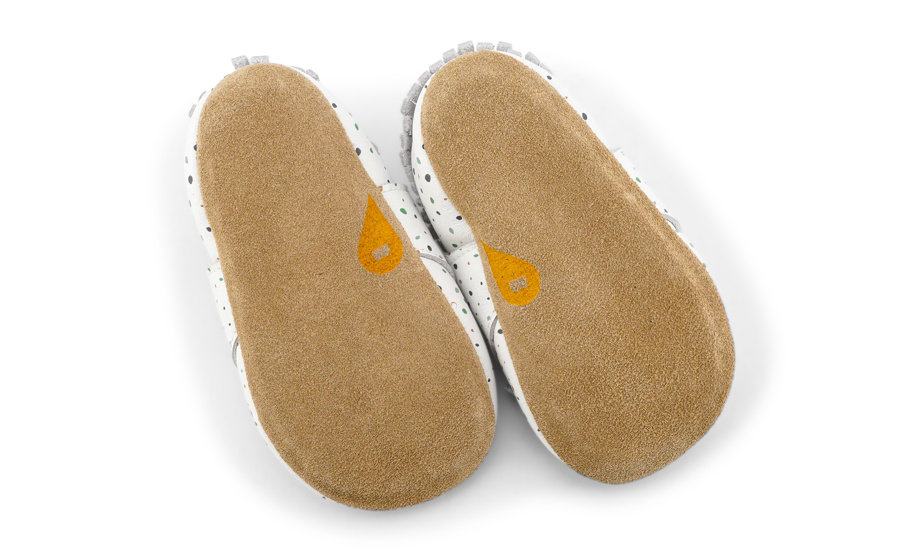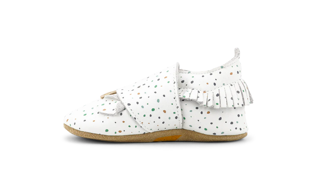 The pared-back looks of the FRECKLES baby shoes are an inviting option for stylish young babes. Crafted from a soft, skin-friendly leather that is speckled with colourful spots, this Soft Sole also has applique and tassel details that invite little fingers to explore. The suede sole provides natural grip and flexion, which is perfect for wriggly toes.