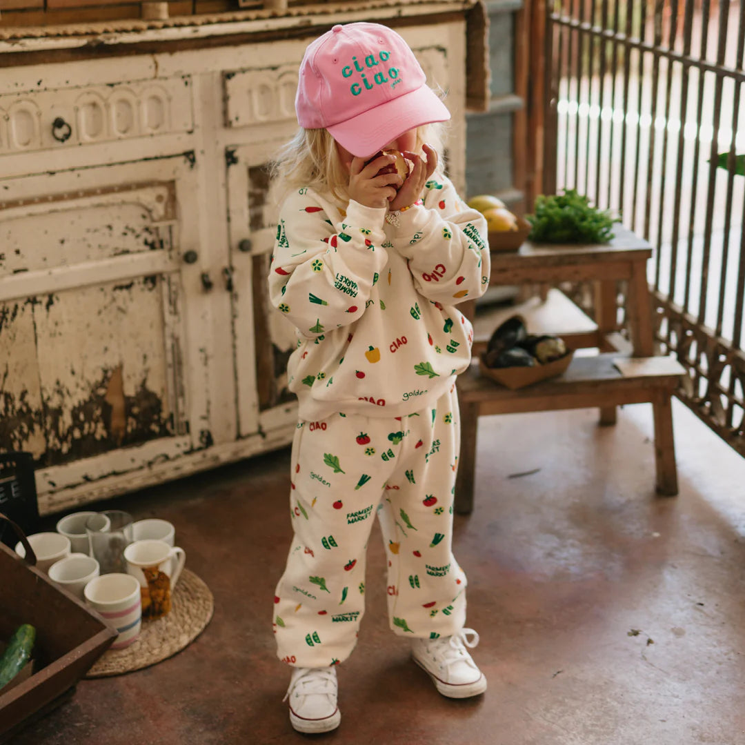 The Ciao Farmers Market track pants are made from 100% French terry fleece cotton with a thick yet soft hand feel. The print is inspired by our love of spending mornings at our local Farmers Market. Where the produce is local and organic - only the best will do!