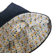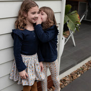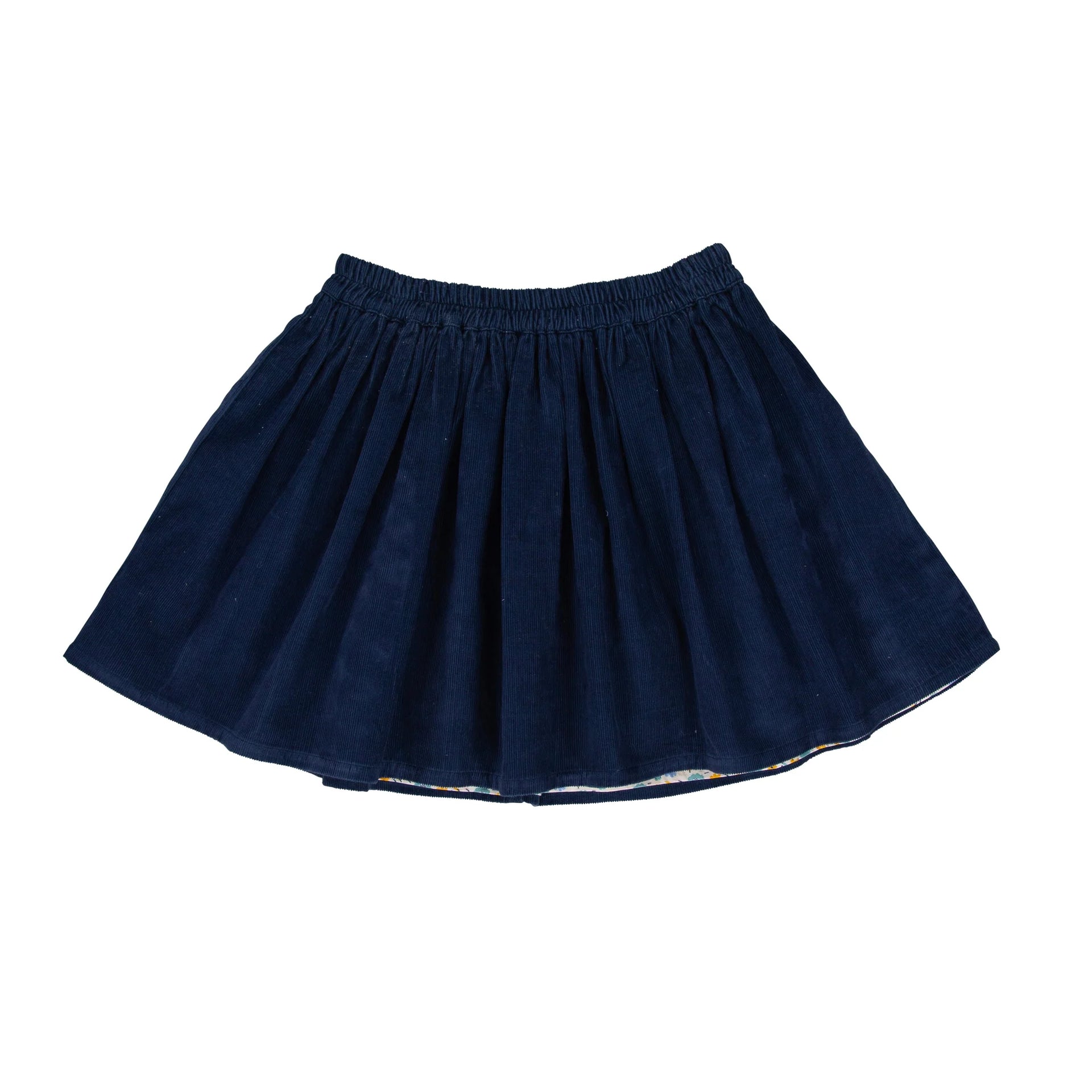 Reversible Blueberry cord flip skirt with elastic waist and Autumn Bloom exclusive printed 100% cotton on inner layer. Wear alternatively with printed cotton layered side out! Two ways to style.
