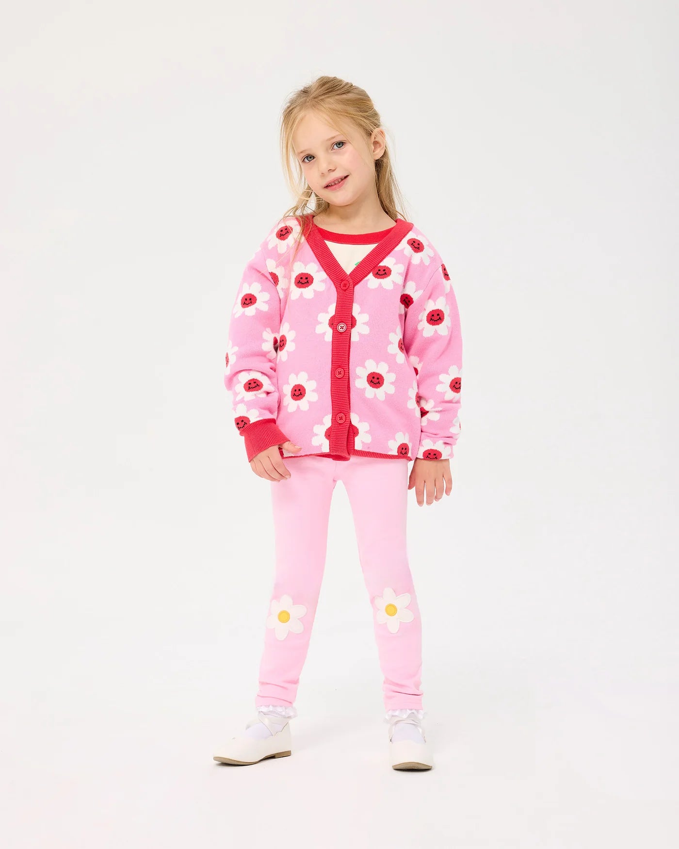 Add a pop of style to your child's wardrobe with these must-have pink Daisy Tights! Crafted from soft brushed cotton elastane ribbing to keep your little one in comfort with freedom to run, jump and play. Perfect for layered fashion showcasing your child's unique styling or simply worn as form fitting pants with our seasonal sweaters. To add a touch of whimsy daisy detailing at the knees for added durability.