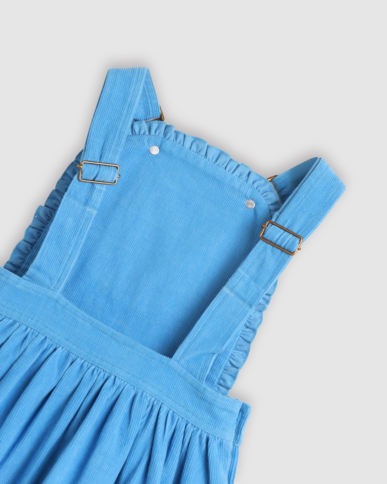 Introducing the Ellie Pinafore Dress in Sky Blue ... The cutest overall dress with a divine frill accent and super cute brass buttons. This dress is the perfect layering piece for when you want to keep warm and stylish !