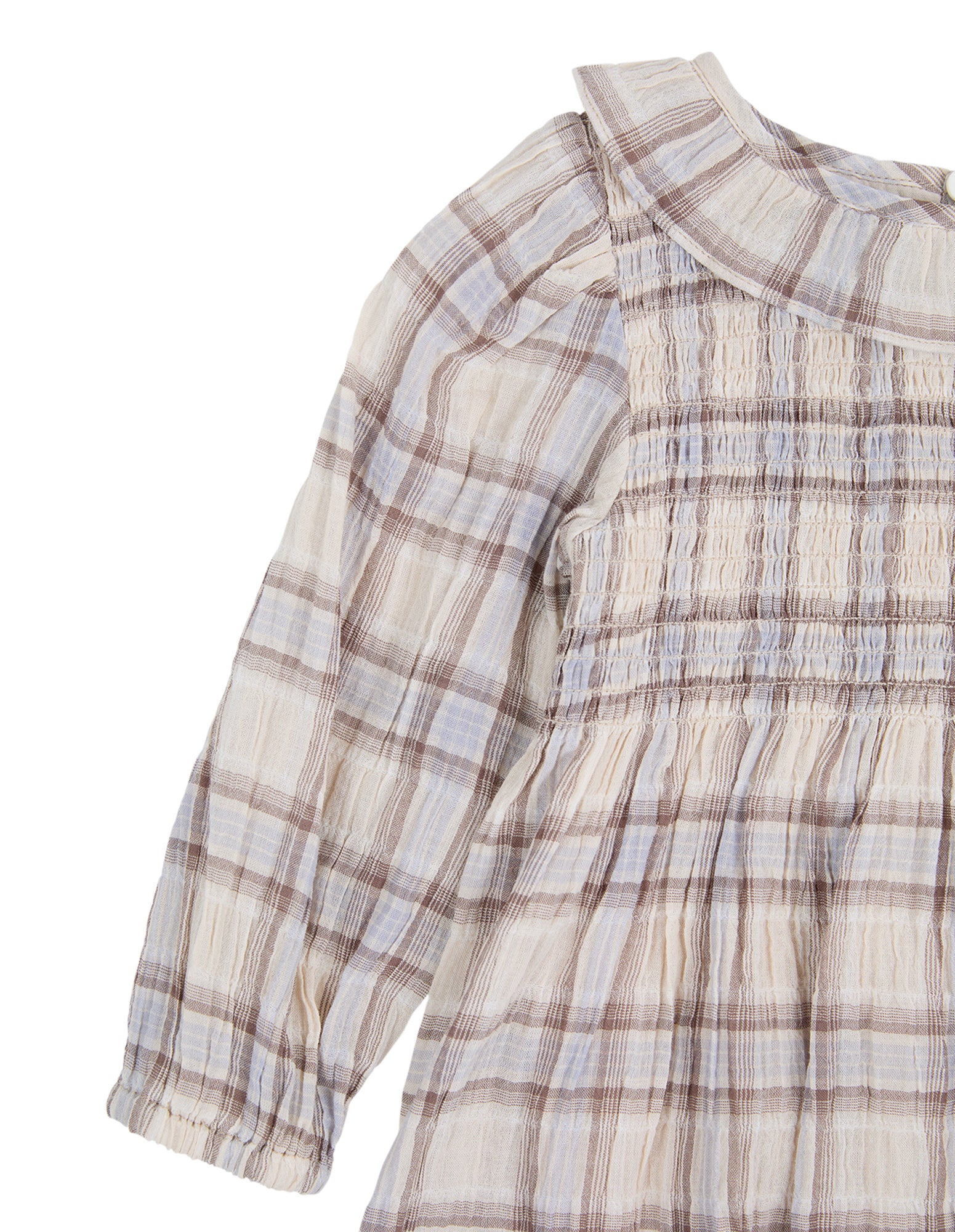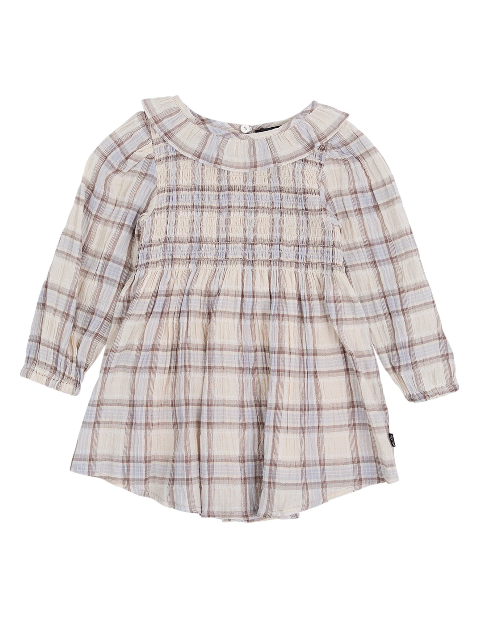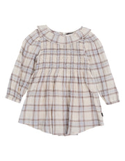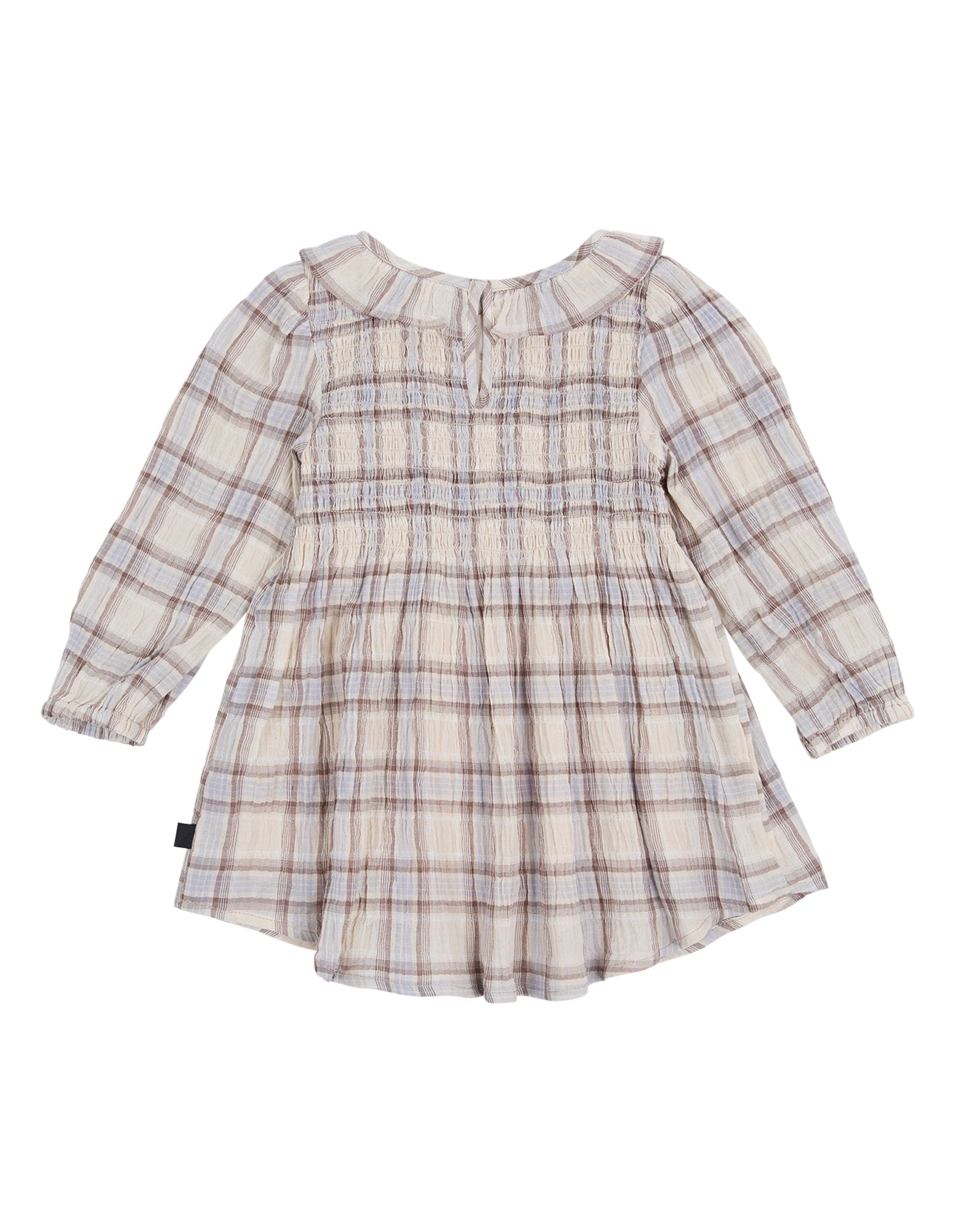The Leader Dress by Animal Crackers is the perfect transeasonal piece. The dress features an all over yarn dyed check, shirring on the top body, frill collar and full sleves finished with elastic cuff. There is a back neck keyhole opening to get easily on and off the body and the gathered skirt to create a cute shape that can be worn for many different occasions throughout the year.