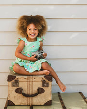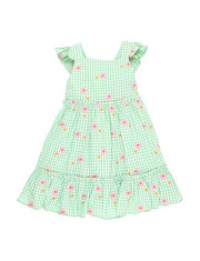 A fresh take on gingham for your littlest flower. This sweet green check tiered dress is scattered with delicate embroidered blooms, and finished with fluttery shoulder frills for extra charm. Fully lined for comfort, it's perfect for special outings or sunny-day play.