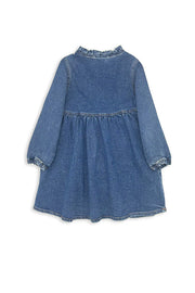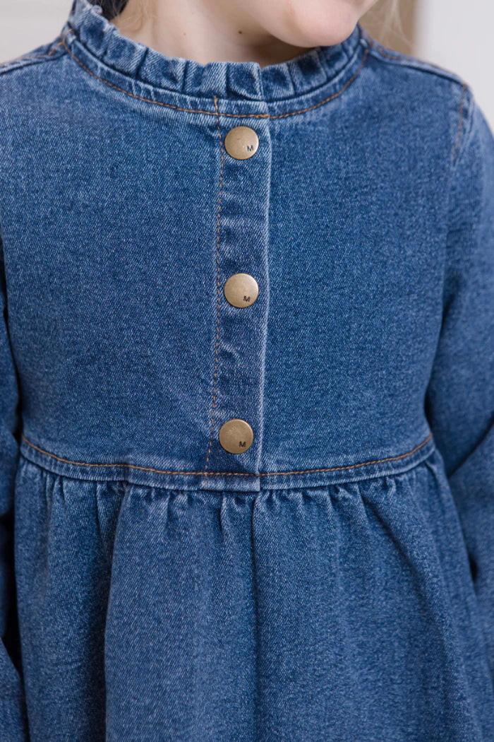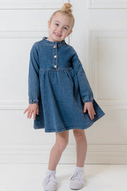 Designed for longevity, this dress is perfect for passing down through the family, making it a cherished addition to any wardrobe. Whether dressed up for a special occasion or worn casually for a playdate with friends, it seamlessly combines style and practicality. Make this mid wash denim dress a staple in your little one’s closet and watch as it becomes a beloved favorite for years to come!