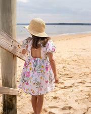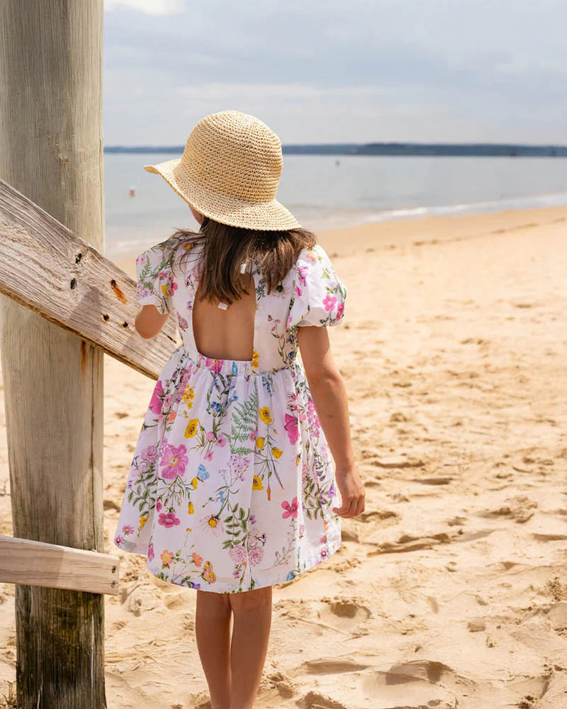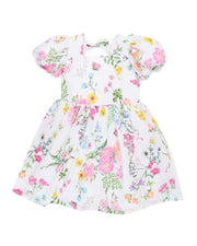 A garden of blooms comes to life on this beautiful puff sleeve dress, perfect for sunny days and special occasions alike. Featuring an open back with adjustable tie, this piece combines sweet vintage charm with a fresh modern twist.