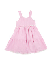Breezy and beautiful for sun-drenched days, this soft pink seersucker dress is made for summer adventures. With a twirly tiered skirt and playful pom pom trims, it's the perfect mix of comfort and charm-just right for garden parties, holidays, and everything in between.