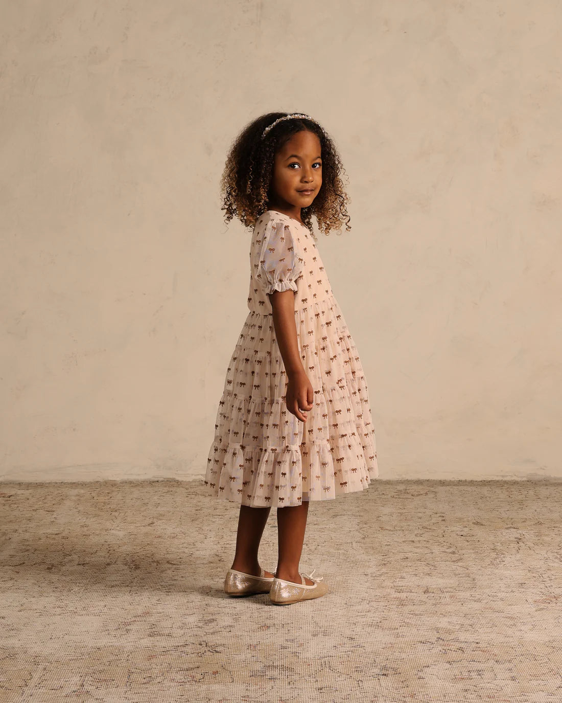 This dreamy, midi-length dress is made up of flocked tulle featuring a layered skirt, full puffed sleeves, and a delicate button back closure, perfect for twirls.