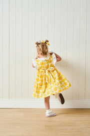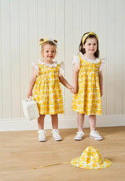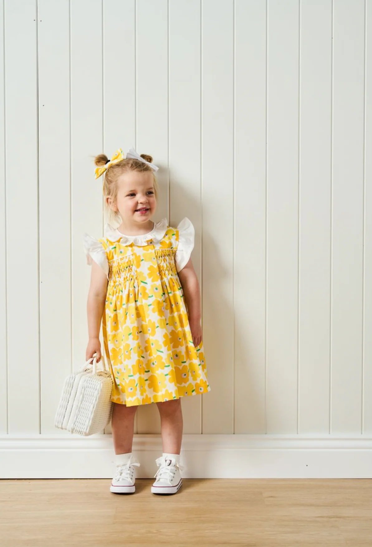 Crisp white flutter frill around collar and sleeve. Crisp white hand gathered criss cross smocking and piped in white cross top and back of dress. Fabric sash tie edged in white. Buttercup buttons.