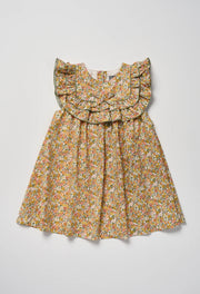 Crafted in a warm white cotton with delicate vine florals in olive green, bumblebee yellow, cantaloupe, and deep musk tones, this dress captures the essence of classic style with a fresh, playful feel.