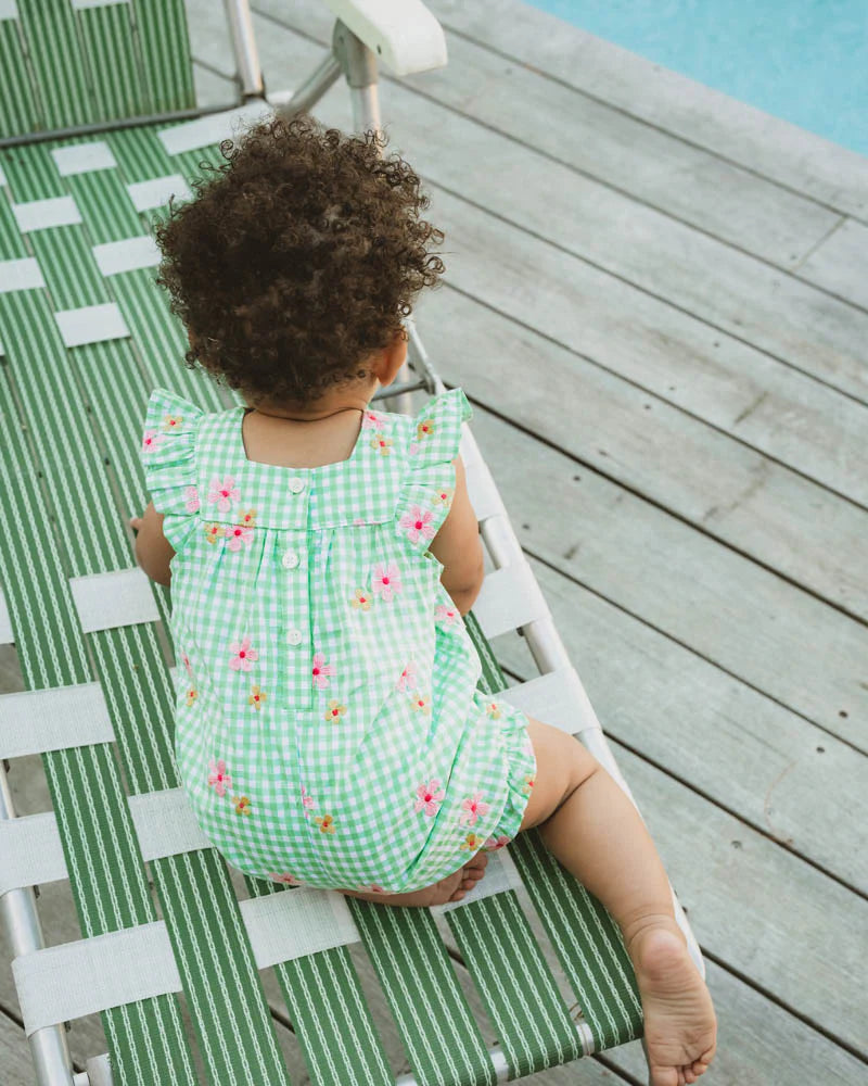 A sweet little playsuit for sunny day adventures, this mint gingham romper is scattered with soft pink floral embroidery and finished with delicate shoulder frills. With a light and airy feel, it's perfect for garden parties, playdates, and all the smiles in between.